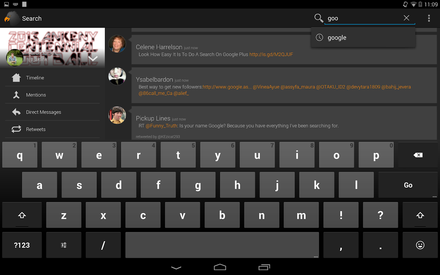 View your timelines (main, mentions, direct messages, links, and pictures)